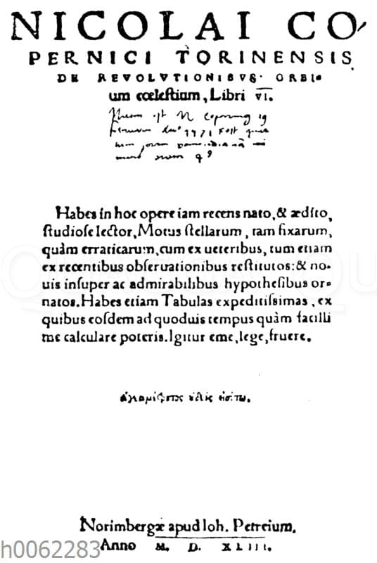 De revolutionibus orbium coelestium (Des révolutions des orbes célestes ou des sphères célestes) est l'œuvre de l'astronome polonais Nicolas Copernic (1473-1543) sur l'héliocentrisme, est imprimée pour la première fois en 1543 à Nuremberg.Le livre offre une version alternative de l'Univers à celle proposée jusque-là par le géocentrisme. publication of De revolutionibus orbium coelestium (On the Revolutions of the Heavenly Spheres) containing his mathematical proofs did not occur until 1543, after a supporter named Rheticus had impatiently taken it upon himself to publish a brief description of the Copernican system (Narratio prima) in 1541. The book, first printed in 1543 in Nuremberg, Holy Roman Empire of the German Nation, offered proof that the Earth went round the Sun, and not vice versa, as had been thought.